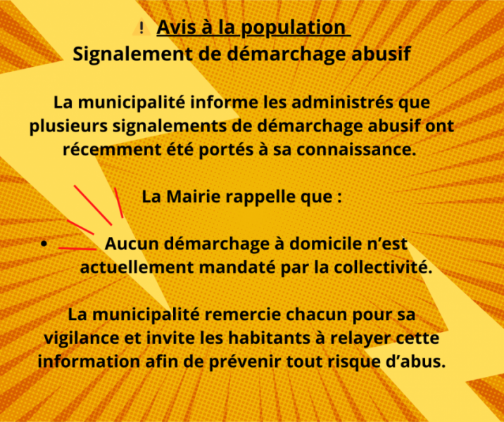 La municipalité informe les administrés que plusieurs signalements de démarchage abusif ont récemment été portés à sa connaissance.